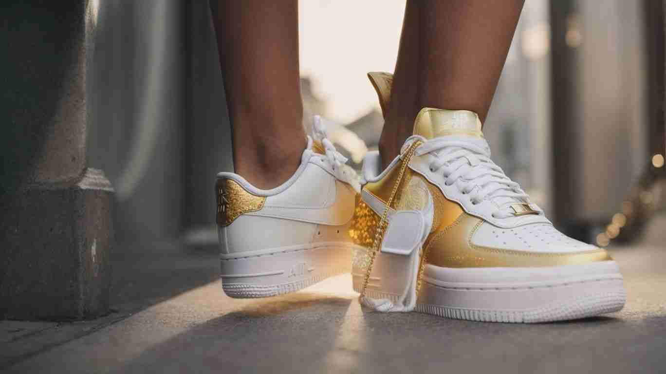A person is wearing white and gold Nike Air Force 1 sneakers on an urban street.