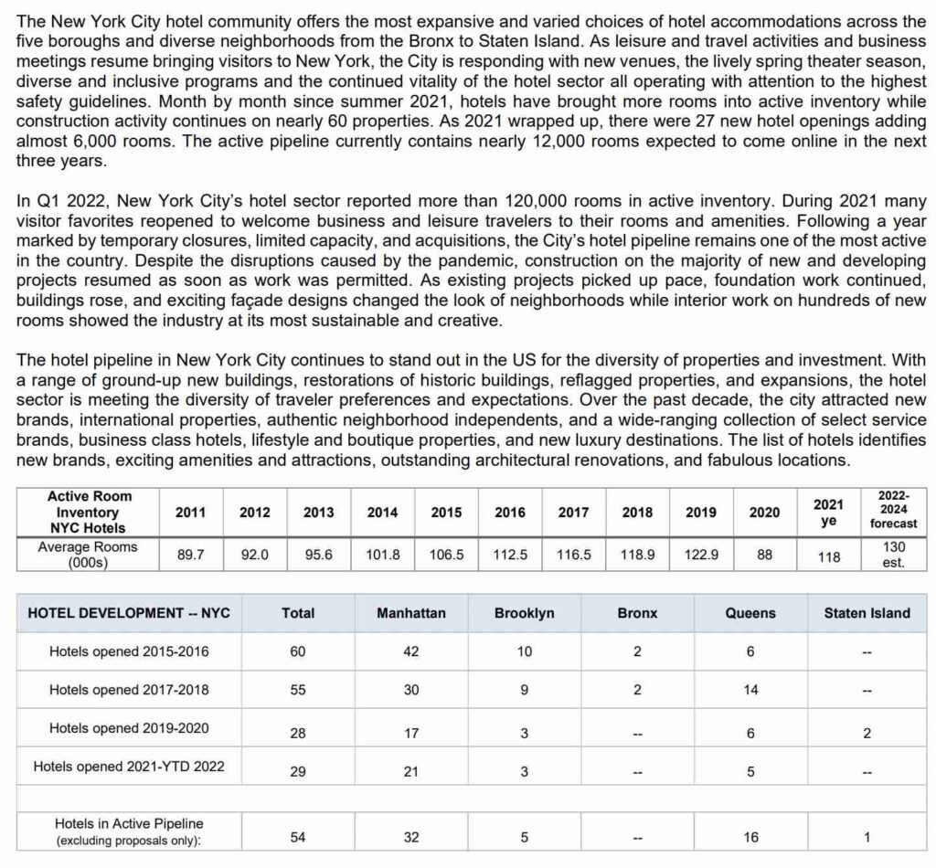 The New York City hotel community offers the most expansive and varied choices of hotel accommodations across the five boroughs and diverse neighborhoods from the Bronx to Staten Island. As leisure and travel activities and business meetings resume bringing visitors to New York, the City is responding with new venues, the lively spring theater season, diverse and inclusive programs and the continued vitality of the hotel sector all operating with attention to the highest safety guidelines. Month by month since summer 2021,