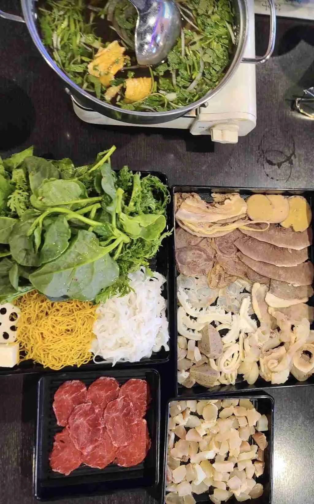 The image shows a variety of uncooked foods including meats, vegetables, noodles, and tofu, arranged in separate compartments, likely for preparing a hot pot meal.