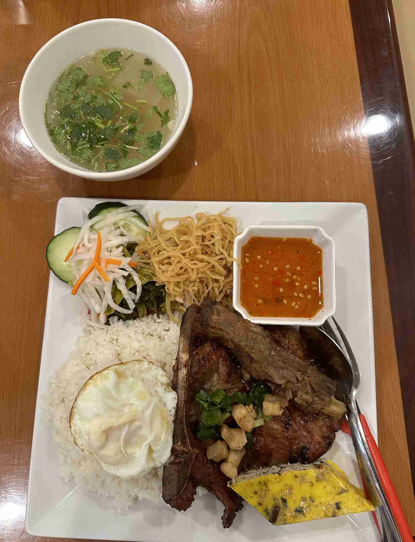 The broken rice plates are a standout at Pho VH, a culinary craft carried over from the owner’s successful food truck. These dishes are meticulously prepared, combining elements like shredded pork skin, egg cake, and grilled pork chop, offering a perfect blend of textures and flavors that are robust and satisfying.